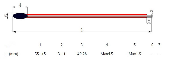 小头径NTC漆包线热敏电阻结构尺寸: