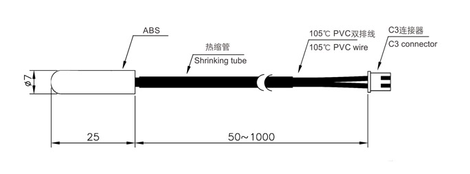 车载冰箱上专用NTC热敏封装感温元器件-MCW-C214,采用MF58热敏电阻(阻值R25℃=10KΩ±1% B值B25/85=3435K±1%±1%),使用了ABS树脂圆柱外壳,导线为PVE线前端加热缩管进行防水保护,长度范围50~1000mm可定制,联接器为C3端子。此款NTC温度传感器专为汽车冰箱设计。